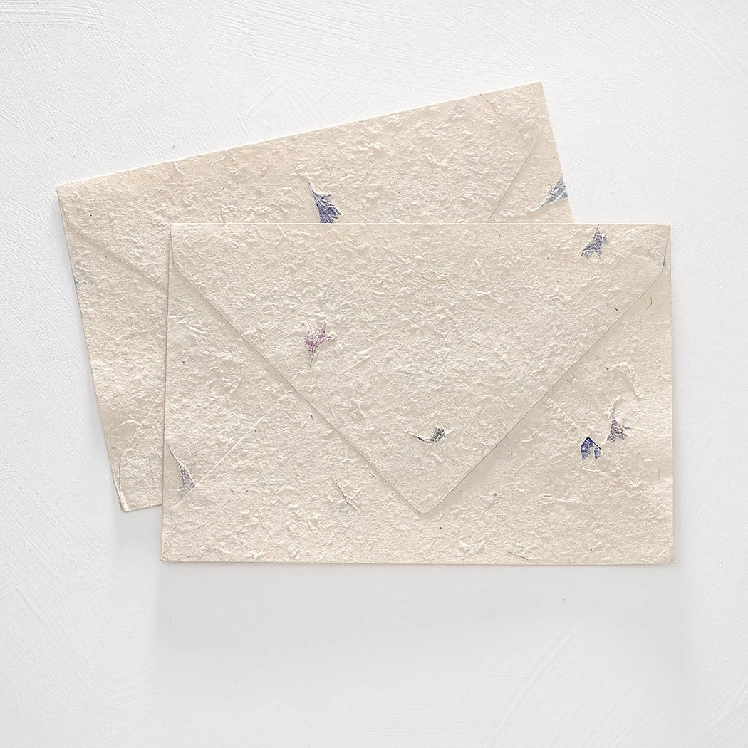 Natural toned and textured handmade envelope is the height of delicacy and sophistication. With real pressed Cornflower Petals blossoms throughout the card, this is the perfect material to make a card your loved one will remember. Processed and made by hand on wooden deckles, this paper is an entirely natural product, with irregularities and flaws which only add to the charm of the paper.