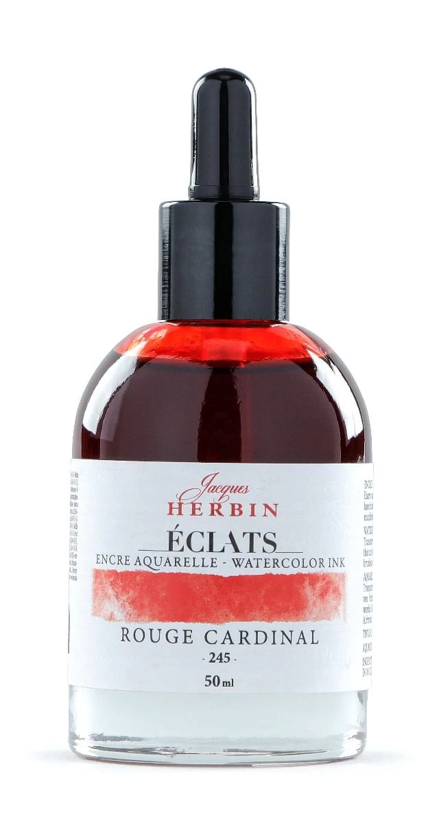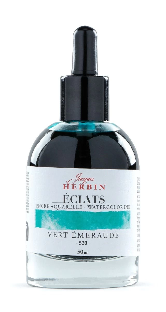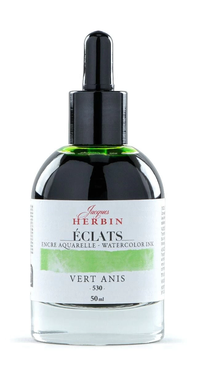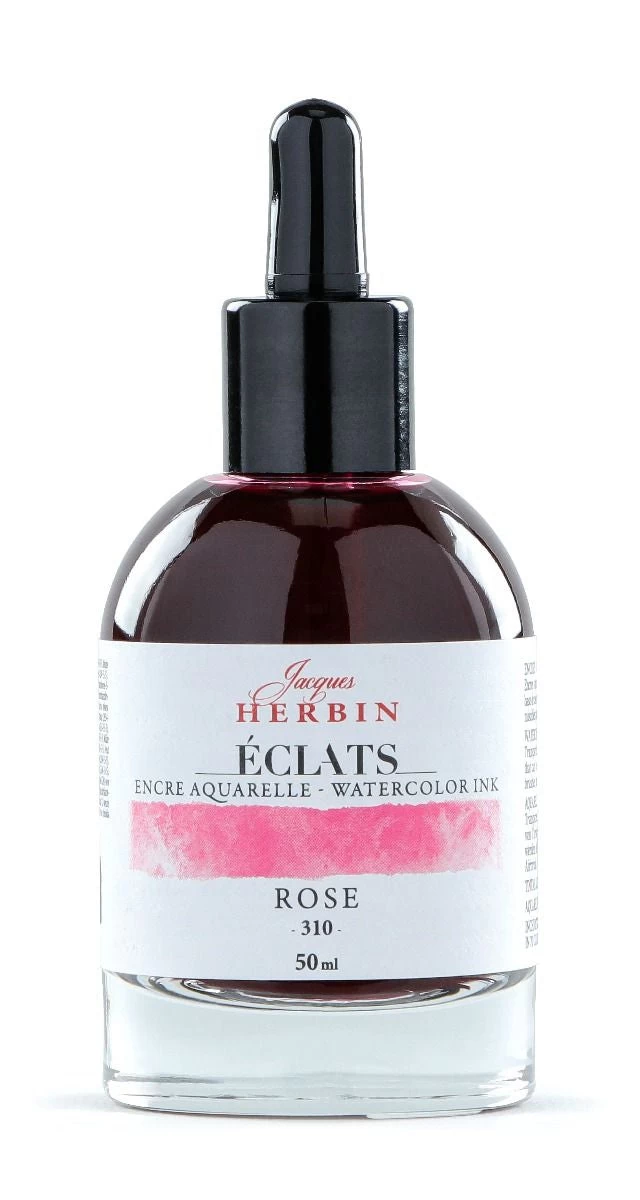Explore the beautiful world of watercolor with Jacques Herbin’s Eclats Ink. Made in France, this range of 70 unique, intense, luminous, and transparent colors can be used both concentrated and diluted. Featuring 62 watercolor shades based on dyes, as well as 4 fluorescent, white, and 3 metallic inks that are opaque and covering.